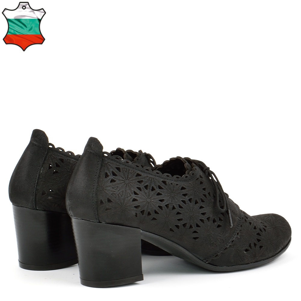 Черни дамски обувки с връзки на анатомичен ток. Моделът е с финна лазeрна перфорация. Височината на тока е 6см. Обувките са изцяло от естествена кожа и са произведени в България.