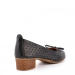 Български дамски черни обувки на нисък, стабилен и удобен ток. Обувите са изработени изцяло от естествена кожа с финна лазеран перурация.
