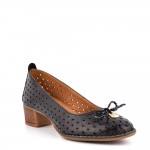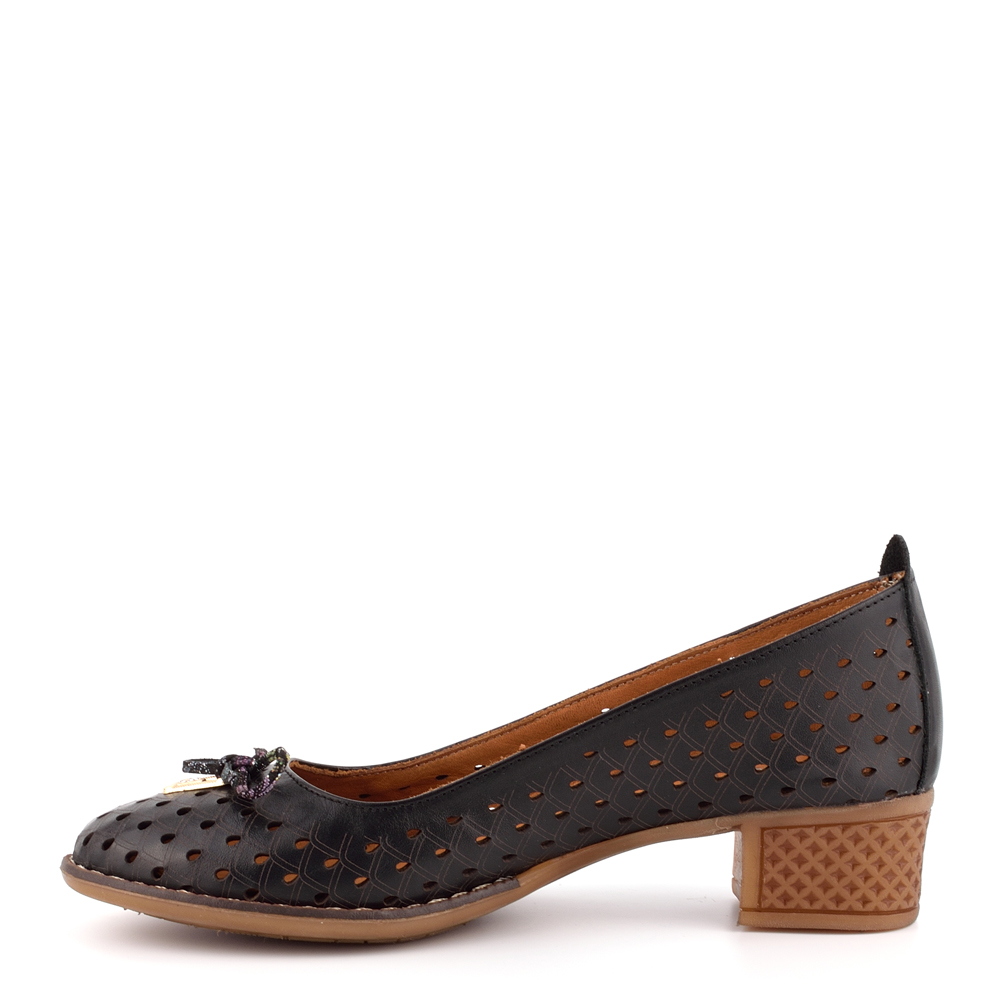 Български дамски черни обувки на нисък, стабилен и удобен ток. Обувите са изработени изцяло от естествена кожа с финна лазеран перурация.