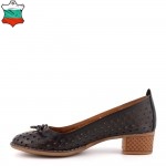 Български дамски черни обувки на нисък, стабилен и удобен ток. Обувите са изработени изцяло от естествена кожа с финна лазеран перурация.