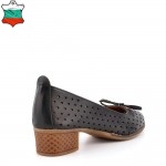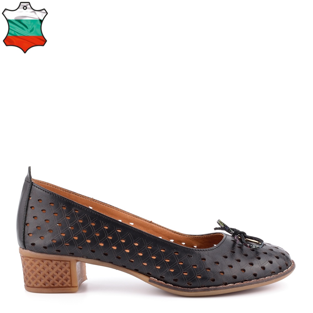Български дамски черни обувки на нисък, стабилен и удобен ток. Обувите са изработени изцяло от естествена кожа с финна лазеран перурация.