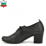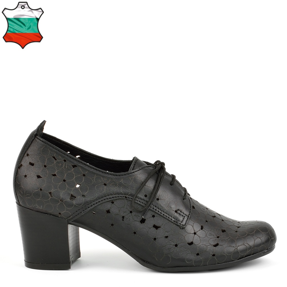Български дамски черни обувки на нисък и стабилен ток, изработени изцяло от естествена кожа и лазерна перфорация. Височината на тока позволява моделът да се носи както в ежедневието така и на работа или за официални поводи.