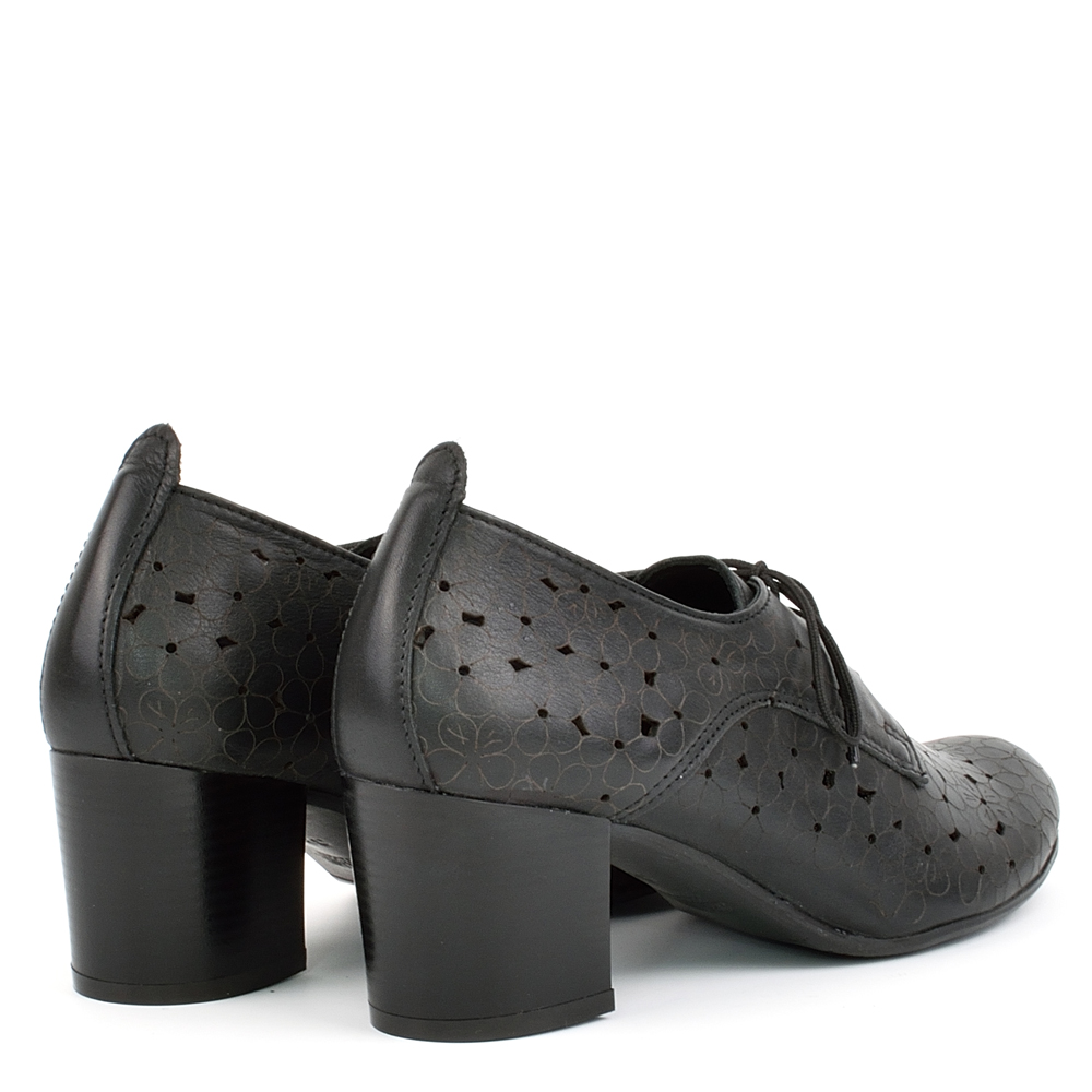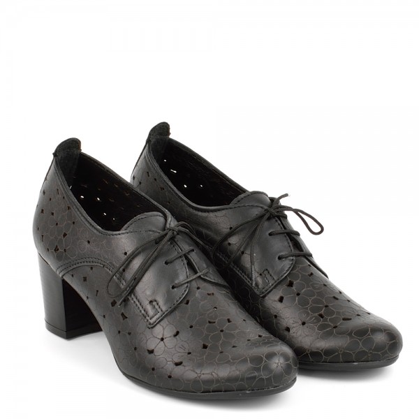 Български дамски черни обувки на нисък и стабилен ток, изработени изцяло от естествена кожа и лазерна перфорация. Височината на тока позволява моделът да се носи както в ежедневието така и на работа или за официални поводи.