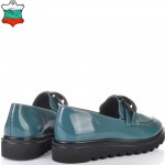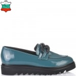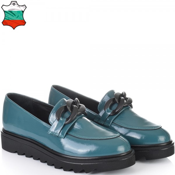 Дамски обувки тип мокасина в страхотен петролен цвят от естествен лак с черна катарама. Топ модел за сезона изключително стилен и удобен, защото стеклата е мека и се оформя по стъпалото на принципа на мемори пяна. Моделът е много лек, тъй като е изработен от олекотено полиуретаново ходило, което следва естествената линия на движение на походката.