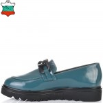 Дамски обувки тип мокасина в страхотен петролен цвят от естествен лак с черна катарама. Топ модел за сезона изключително стилен и удобен, защото стеклата е мека и се оформя по стъпалото на принципа на мемори пяна. Моделът е много лек, тъй като е изработен от олекотено полиуретаново ходило, което следва естествената линия на движение на походката.