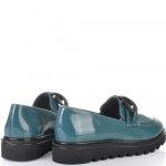 Дамски обувки тип мокасина в страхотен петролен цвят от естествен лак с черна катарама. Топ модел за сезона изключително стилен и удобен, защото стеклата е мека и се оформя по стъпалото на принципа на мемори пяна. Моделът е много лек, тъй като е изработен от олекотено полиуретаново ходило, което следва естествената линия на движение на походката.