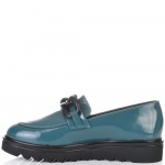 Дамски обувки тип мокасина в страхотен петролен цвят от естествен лак с черна катарама. Топ модел за сезона изключително стилен и удобен, защото стеклата е мека и се оформя по стъпалото на принципа на мемори пяна. Моделът е много лек, тъй като е изработен от олекотено полиуретаново ходило, което следва естествената линия на движение на походката.