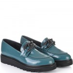 Дамски обувки тип мокасина в страхотен петролен цвят от естествен лак с черна катарама. Топ модел за сезона изключително стилен и удобен, защото стеклата е мека и се оформя по стъпалото на принципа на мемори пяна. Моделът е много лек, тъй като е изработен от олекотено полиуретаново ходило, което следва естествената линия на движение на походката.