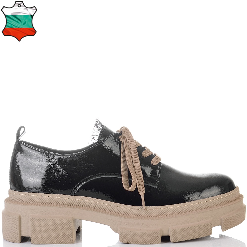 Изключително удобни на спортно-елегантно бежово ходило в черен естествен лак, нашите нови обувки ще Ви накарат да се чувствате прекрасно. Обувките имат нежна черна дантела на езика, а връзките са в бежов цвят, който се съчетава перфектно с цвета на ходилото.Тези обувки са изключително удобни, защото са изработени от полиуретаново ходило, което следва естествената линия на движение на походката. Лесно се съчетават с всякакви тоалети във Вашето ежедневие, от рокли и поли, до панталони и дънки с тях ще сте неотразима, защото комфорта Ви отива.