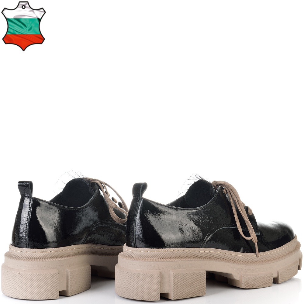 Изключително удобни на спортно-елегантно бежово ходило в черен естествен лак, нашите нови обувки ще Ви накарат да се чувствате прекрасно. Обувките имат нежна черна дантела на езика, а връзките са в бежов цвят, който се съчетава перфектно с цвета на ходилото.Тези обувки са изключително удобни, защото са изработени от полиуретаново ходило, което следва естествената линия на движение на походката. Лесно се съчетават с всякакви тоалети във Вашето ежедневие, от рокли и поли, до панталони и дънки с тях ще сте неотразима, защото комфорта Ви отива.