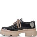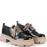Изключително удобни на спортно-елегантно бежово ходило в черен естествен лак, нашите нови обувки ще Ви накарат да се чувствате прекрасно. Обувките имат нежна черна дантела на езика, а връзките са в бежов цвят, който се съчетава перфектно с цвета на ходилото.Тези обувки са изключително удобни, защото са изработени от полиуретаново ходило, което следва естествената линия на движение на походката. Лесно се съчетават с всякакви тоалети във Вашето ежедневие, от рокли и поли, до панталони и дънки с тях ще сте неотразима, защото комфорта Ви отива.