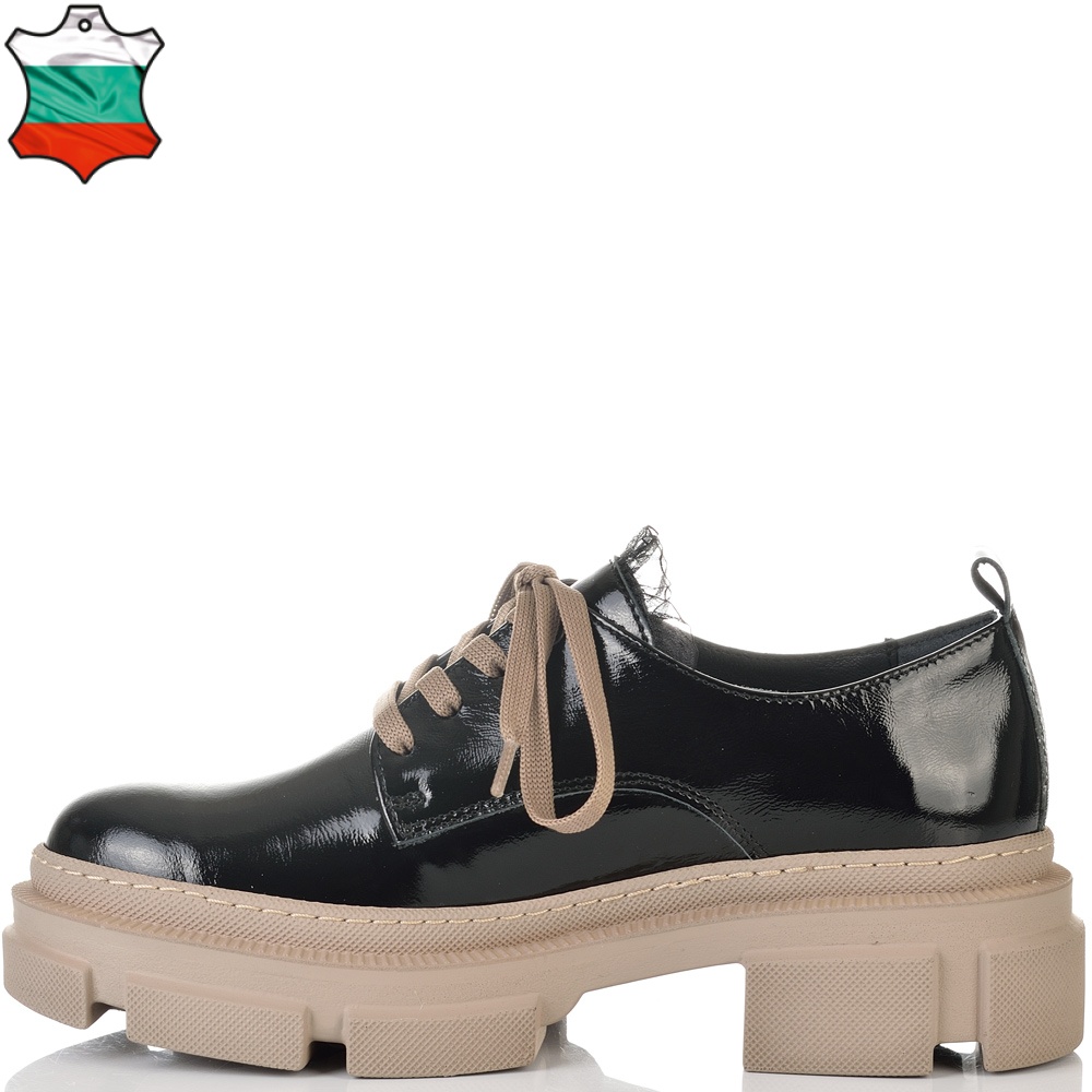 Изключително удобни на спортно-елегантно бежово ходило в черен естествен лак, нашите нови обувки ще Ви накарат да се чувствате прекрасно. Обувките имат нежна черна дантела на езика, а връзките са в бежов цвят, който се съчетава перфектно с цвета на ходилото.Тези обувки са изключително удобни, защото са изработени от полиуретаново ходило, което следва естествената линия на движение на походката. Лесно се съчетават с всякакви тоалети във Вашето ежедневие, от рокли и поли, до панталони и дънки с тях ще сте неотразима, защото комфорта Ви отива.