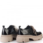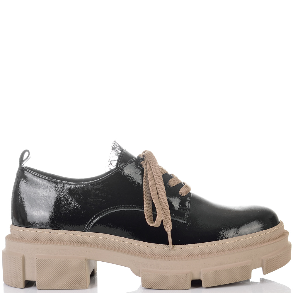 Изключително удобни на спортно-елегантно бежово ходило в черен естествен лак, нашите нови обувки ще Ви накарат да се чувствате прекрасно. Обувките имат нежна черна дантела на езика, а връзките са в бежов цвят, който се съчетава перфектно с цвета на ходилото.Тези обувки са изключително удобни, защото са изработени от полиуретаново ходило, което следва естествената линия на движение на походката. Лесно се съчетават с всякакви тоалети във Вашето ежедневие, от рокли и поли, до панталони и дънки с тях ще сте неотразима, защото комфорта Ви отива.