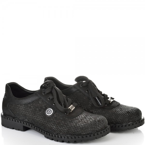 Класически модел дамски обувки с връзки на лек ток в ефектна черна кожа. Страхотен модел за сезона изключително стилен и удобен с тях ще се чувствате неотразима. Лесно се съчетава с всякакави тоалети и е подходящ както за ежедневието така и за официални случаи и поводи. Стелката на модела е с три меки и анатомични зони – пета, свод и възглавничка. Моделът е много лек, защото е изработен от олекотено и гъвкаво ходило, което следва естествената линия на движение на походката.