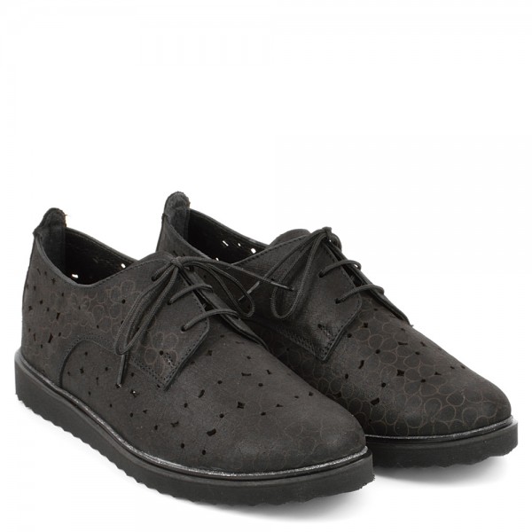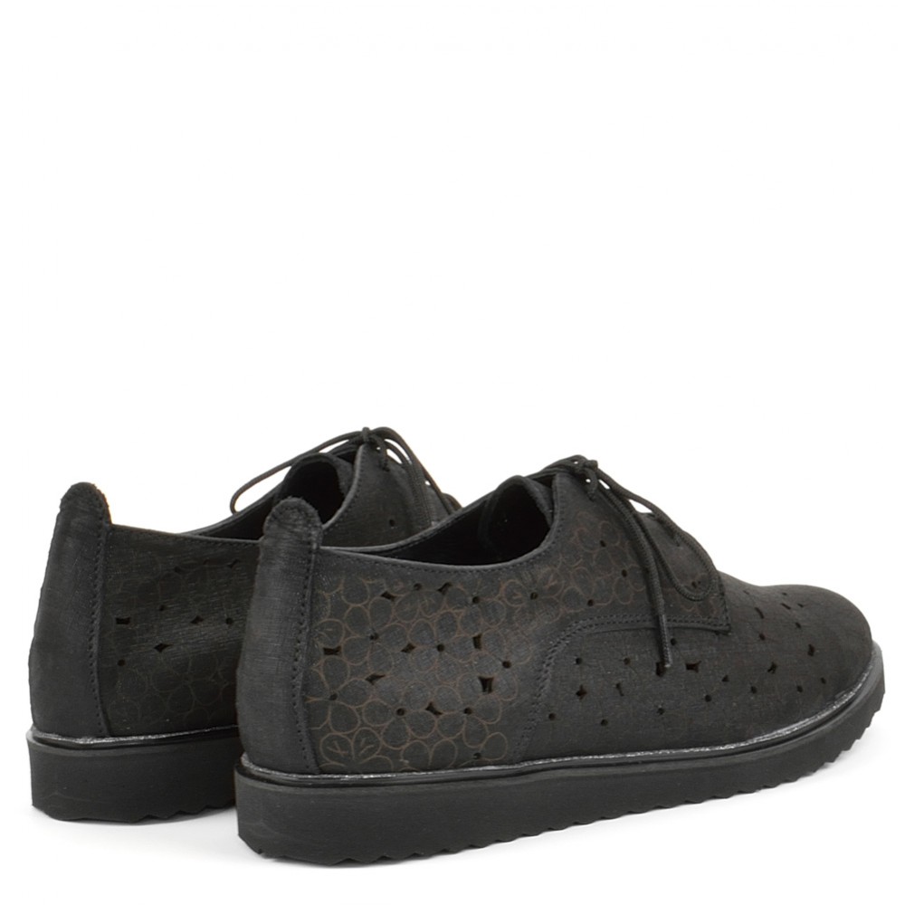 Изключително леки, меки и на олекотено ходило, тези обувки с лазерна изработка и ефектна кожа в черен цвят са перфектният избор за Вашия ежедневен комфорт. Подходящи са както за пролетта така и за лятото, заради перфорацията и лесно се съчетават с всякакви тоалети от дънки и панталони до поли и рокли. А ходилото е леко меко и изолирано и следва естествената линия на походката, а така комфорта ще Ви следва навсякъде.
