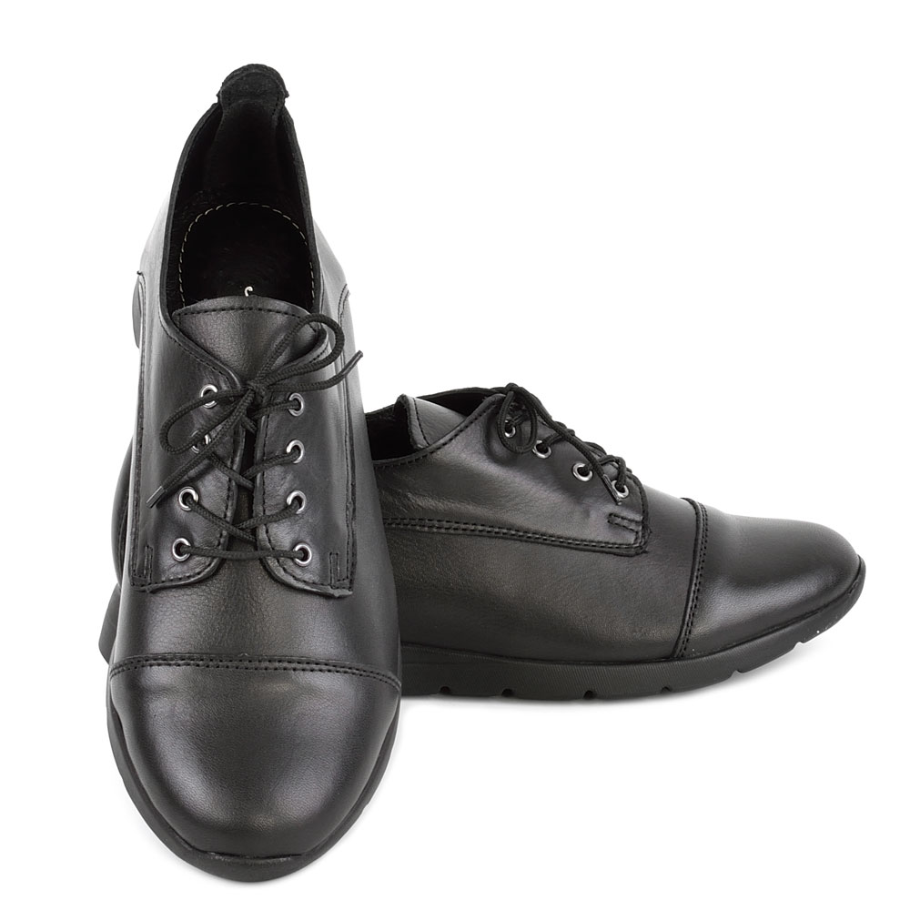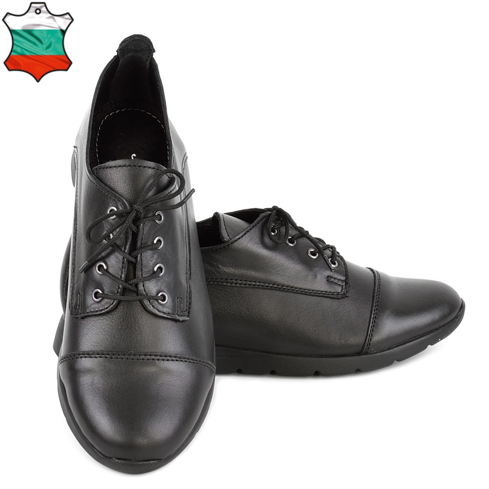 Дамски обувки от естествена кожа в черен цвят. Висококачествената естествена кожа и перфектната изработка, придават стил и елегантност на модела. Тези обувки са подходящи за ежедневието, защото лесно се съчетава с много тоалети от рокли и поли, до дънки и панталони. Ходилото следва естествената линия и движения на походката.