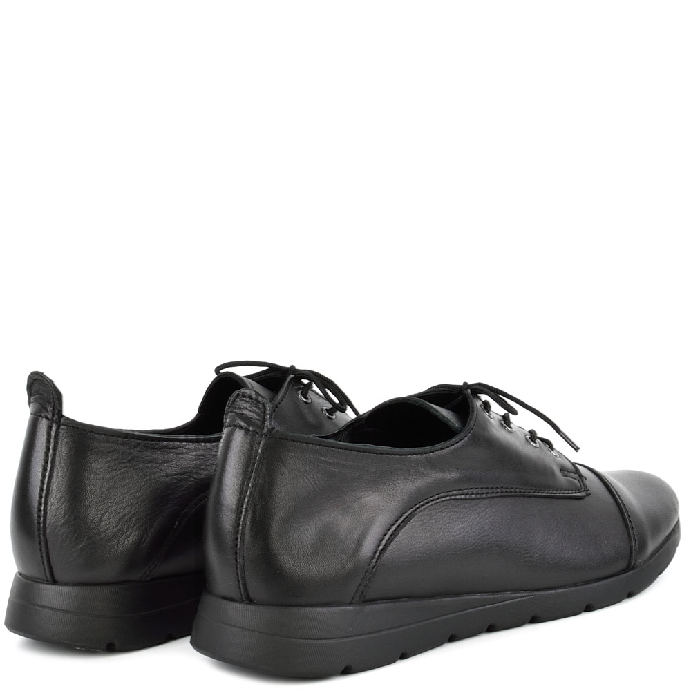 Дамски обувки от естествена кожа в черен цвят. Висококачествената естествена кожа и перфектната изработка, придават стил и елегантност на модела. Тези обувки са подходящи за ежедневието, защото лесно се съчетава с много тоалети от рокли и поли, до дънки и панталони. Ходилото следва естествената линия и движения на походката.