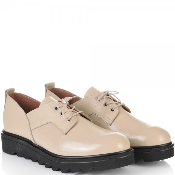 Дамски ежедневни обувки с връзки в съчетание на бежов лак с бежова кожа. Моделът изключително стилен и удобен и лесно се съчетава с всякакъв тип тоалети. Стелката е мека и се оформя по стъпалото на принципа на мемори пяна. Моделът е много лек, защото е изработен от олекотено полиуретаново ходило, което следва естествената линия на движение на походката.