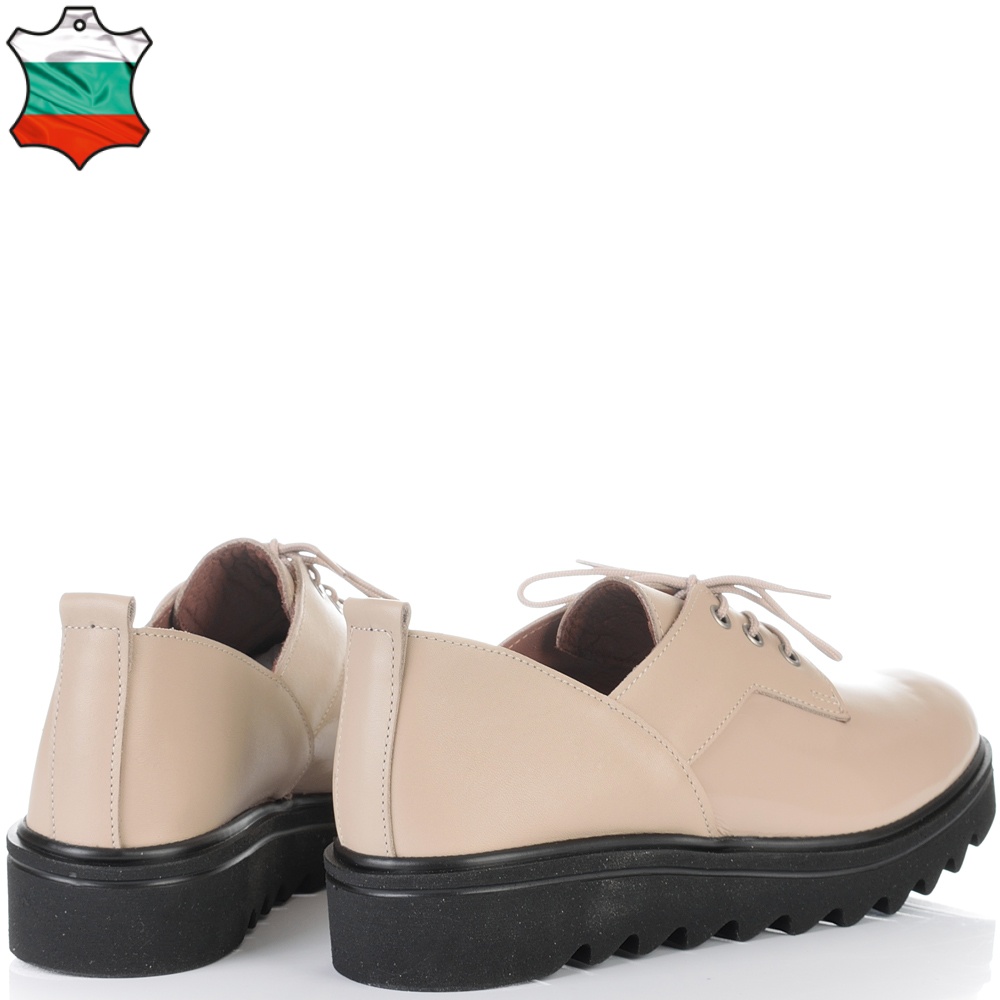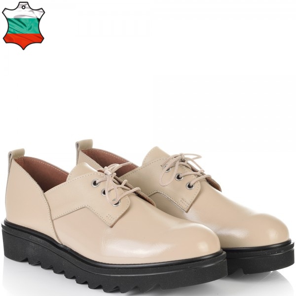 Дамски ежедневни обувки с връзки в съчетание на бежов лак с бежова кожа. Моделът изключително стилен и удобен и лесно се съчетава с всякакъв тип тоалети. Стелката е мека и се оформя по стъпалото на принципа на мемори пяна. Моделът е много лек, защото е изработен от олекотено полиуретаново ходило, което следва естествената линия на движение на походката.
