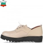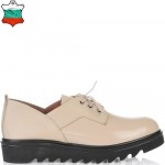 Дамски ежедневни обувки с връзки в съчетание на бежов лак с бежова кожа. Моделът изключително стилен и удобен и лесно се съчетава с всякакъв тип тоалети. Стелката е мека и се оформя по стъпалото на принципа на мемори пяна. Моделът е много лек, защото е изработен от олекотено полиуретаново ходило, което следва естествената линия на движение на походката.