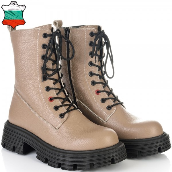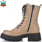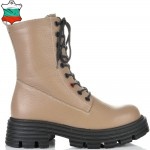 Страхотни боти от естествена кожа - мек шегрен в бежов цвят страхотно съчетани с черно ходило. Кожата на този модел е много мека и страхотно се оформя по крака, също така за по-голямо удобство моделът има връзки и цип за лесно пристягане и оформяне по крака, веднъж настроени връзките след това ботите се събуват и обуват само с ципа. Тези боти ще осигурят нужния Ви комфорт, топлина и удобство през целия ден, защото вътрешната част на модела е с тънък, мек и топъл хастар подходящ за зимата. В допълнение моделът е с олекотено термокаучуково ходило и дебел гарйфер, което е много стабилно и не се пързаля на заледени и заснежени участъци.