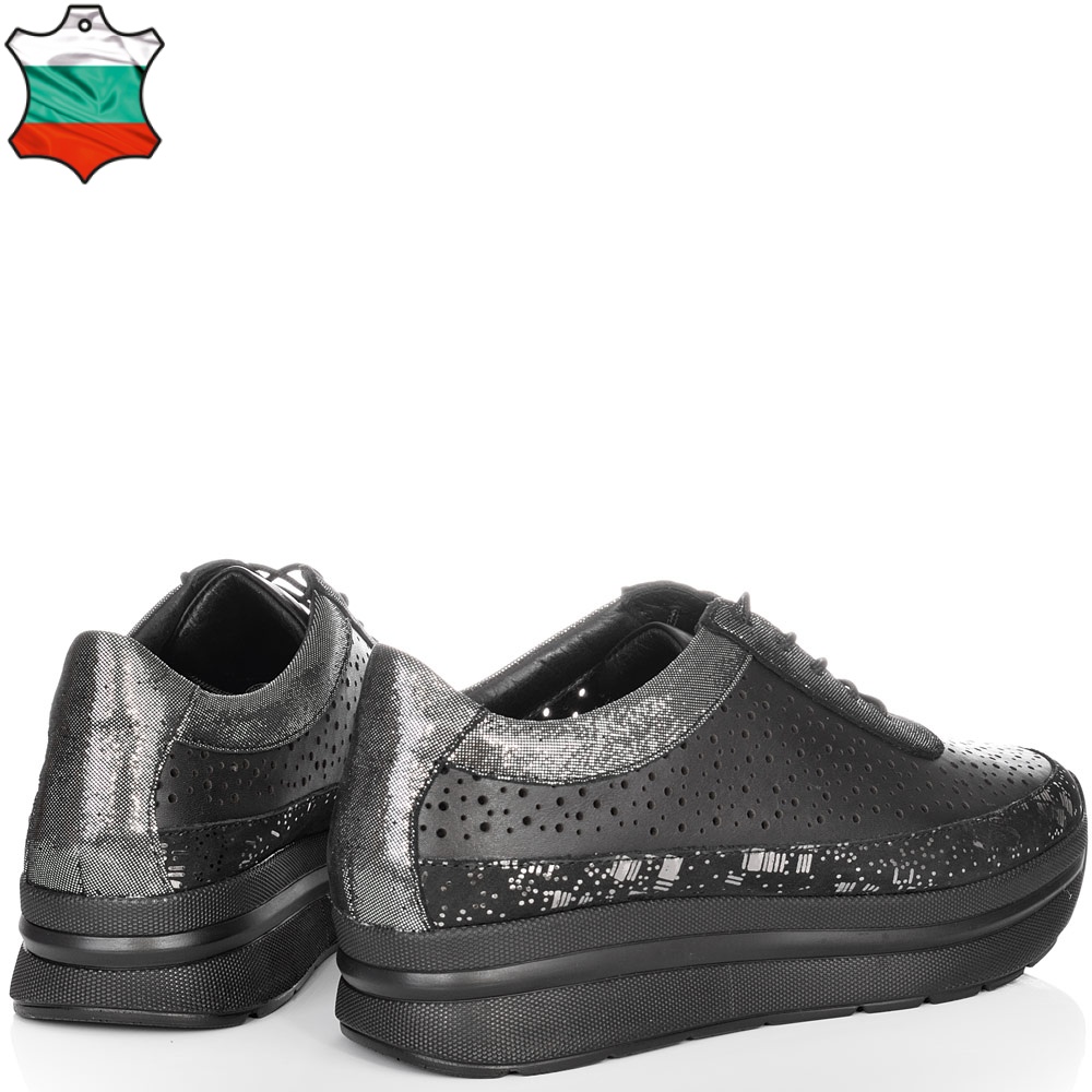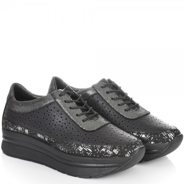 Дамски обувки на цялостна платформа с лазерна перфорация в нежно съчетание на черно и ефектни бронзови кожи. Перфектен избор, защото са подходящи както за пролетта така и за лятото, заради самата перфорацията, а и лесно се съчетават с всякакви тоалети от дънки и панталони, до поли и рокли. Стелката на модела е мека, а ходилото е олекотено полиуретаново, което е много стабилно и перфектно допринася за цялостния комфорт на модела.