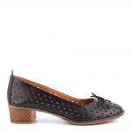 Български дамски черни обувки на нисък, стабилен и удобен ток. Обувите са изработени изцяло от естествена кожа с финна лазеран перурация.