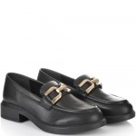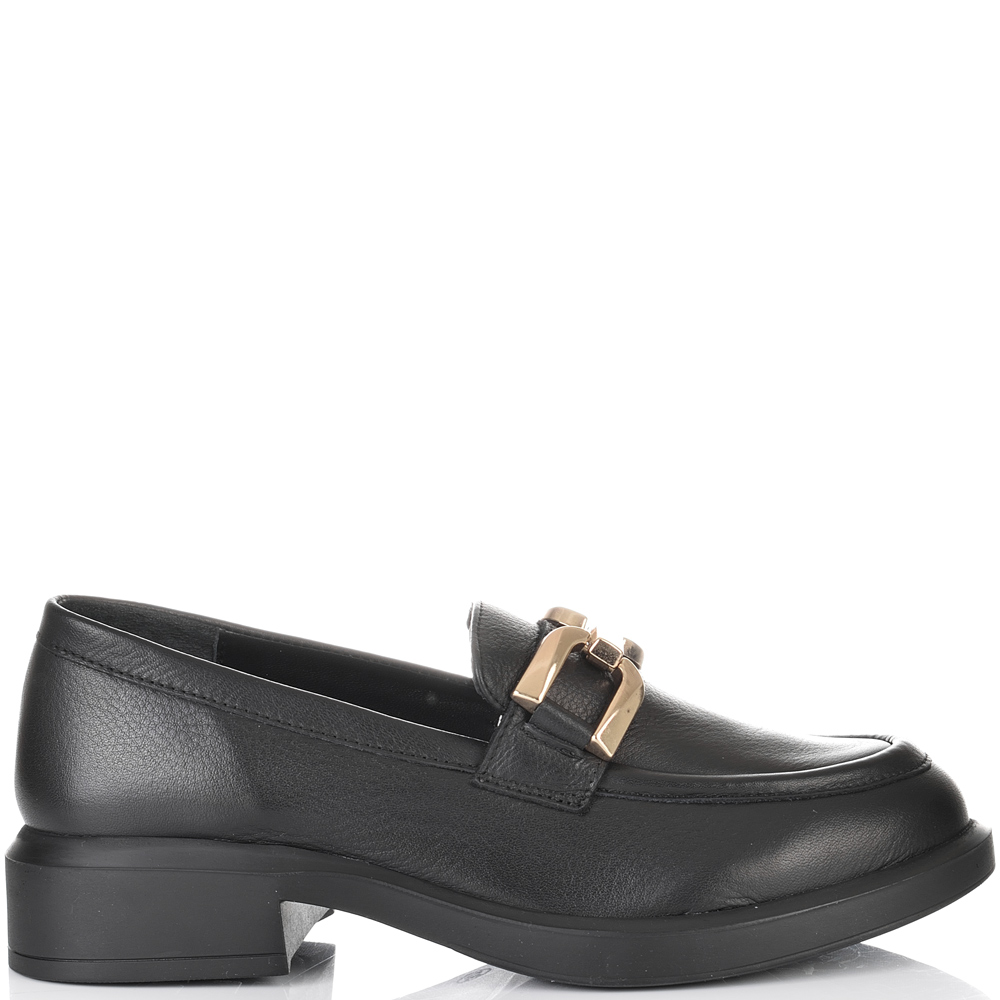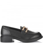 Дамски обувки тип мокасина в черен цвят на черно ходило с метален златен елемент. Моделът е изработен от много мека и качествена естествена кожа, която прилепва и се оформя по крака. Подходящи са както за есента така и за пролетта. Ходилото е много стабилно и перфектно допринася за цялостния комфорт на модела.
