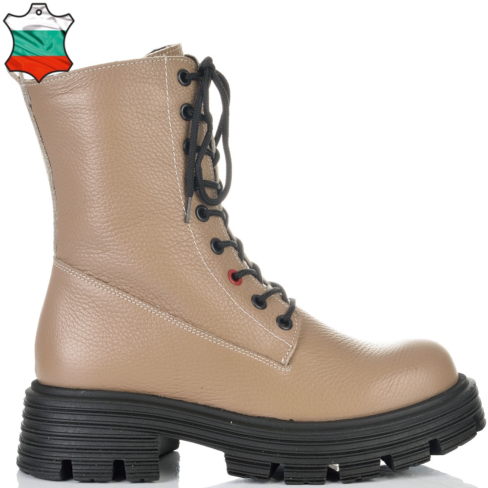 Страхотни боти от естествена кожа - мек шегрен в бежов цвят страхотно съчетани с черно ходило. Кожата на този модел е много мека и страхотно се оформя по крака, също така за по-голямо удобство моделът има връзки и цип за лесно пристягане и оформяне по крака, веднъж настроени връзките след това ботите се събуват и обуват само с ципа. Тези боти ще осигурят нужния Ви комфорт, топлина и удобство през целия ден, защото вътрешната част на модела е с тънък, мек и топъл хастар подходящ за зимата. В допълнение моделът е с олекотено термокаучуково ходило и дебел гарйфер, което е много стабилно и не се пързаля на заледени и заснежени участъци.