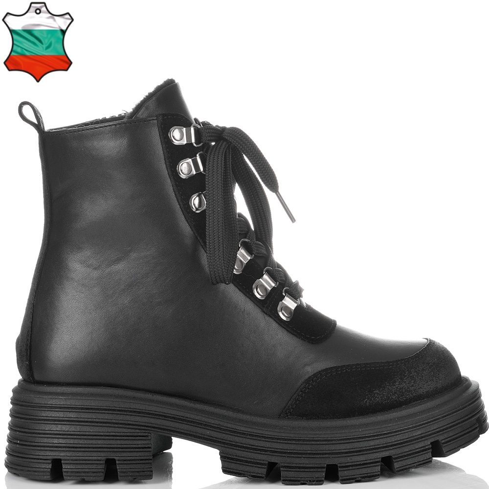 Невероятни боти от естествена кожа и елементи от естествен набук в черен цвят страхотно съчетани с модерно ходило. Кожата на този модел е много гладка и страхотно се оформя по крака, също така за по-голямо удобство моделът има връзки и цип за лесно пристягане и оформяне по крака, веднъж настроени връзките след това ботите се събуват и обуват само с ципа. Тези боти ще осигурят нужния Ви комфорт, топлина и удобство през целия ден, защото вътрешната част на модела е с тънък, мек и топъл хастар подходящ за зимата. В допълнение моделът е с олекотено термокаучуково ходило и дебел гарйфер, което е много стабилно и не се пързаля на заледени и заснежени участъци.