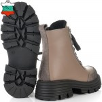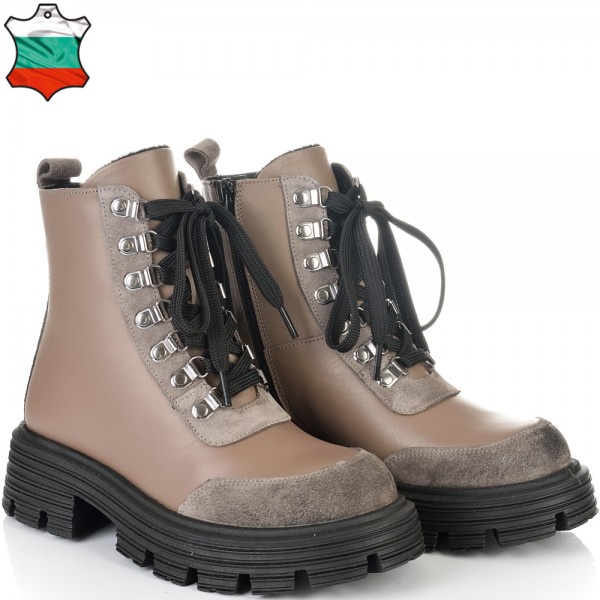 Невероятни боти от естествена кожа и елементи от естествен набук в цвят таупе страхотно съчетани с черно ходило. Кожата на този модел е много гладка и страхотно се оформя по крака, също така за по-голямо удобство моделът има връзки и цип за лесно пристягане и оформяне по крака, веднъж настроени връзките след това ботите се събуват и обуват само с ципа. Тези боти ще осигурят нужния Ви комфорт, топлина и удобство през целия ден, защото вътрешната част на модела е с тънък, мек и топъл хастар подходящ за зимата. В допълнение моделът е с олекотено термокаучуково ходило и дебел гарйфер, което е много стабилно и не се пързаля на заледени и заснежени участъци.
