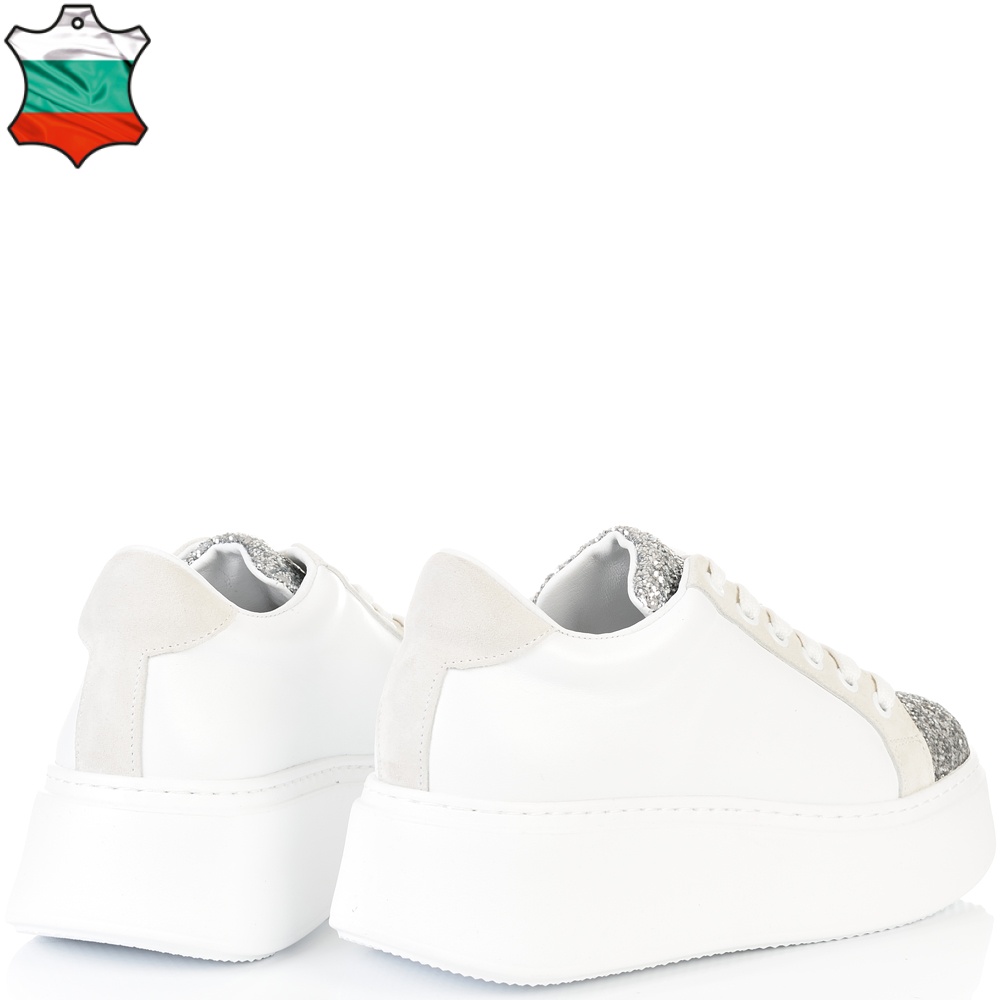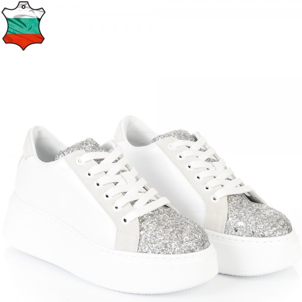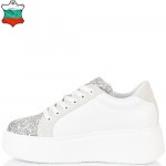 Уникални и неповторими кецове на високо повдигнато ходило с ефектен брокат в сребристо, в нежно съчетание на бяла естествена кожа и сив естествен велур. Блясъкът винаги е на мода, а с тези кецове просто ще заблестите. Вътрешната част на модела също е изцяло от естествена кожа, а стелката е Footbed, която е изключително мека и се оформя по стъпалото на принципа на мемори пяна. В допълнение моделът е с олекотено полиуретаново ходило, шито и лепено, което перфектно допълва комфорта на модела и следва естествената линия на движение на краката. С тях ще бъдете просто неотразима.