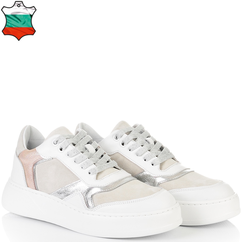 Стлни и нежни кецове в съчетание на бяла естествена кожа, бял велур и ефектни свежи цветове на хамелеонова пудра и сребристо. Моделът ще допринесе много свежест и стил във вашата визия. Вътрешната част на модела също е изцяло от естествена кожа, а стелката е Footbed, която е изключително мека и се оформя по стъпалото на принципа на мемори пяна. В допълнение моделът е с олекотено полиуретаново ходило, шито и лепено, което перфектно допълва комфорта на модела и следва естествената линия на движение на краката.