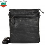Мъжка черна чанта от естествена кожа, българско производство. Чантата има 4-ри външни джоба всеки с цип и два вътрешни-един с цип и един без цип. Дръжката е от текстил и дължината й се регулира. Размери на чантата: височина-28см, дължина-23см, ширина-4см.