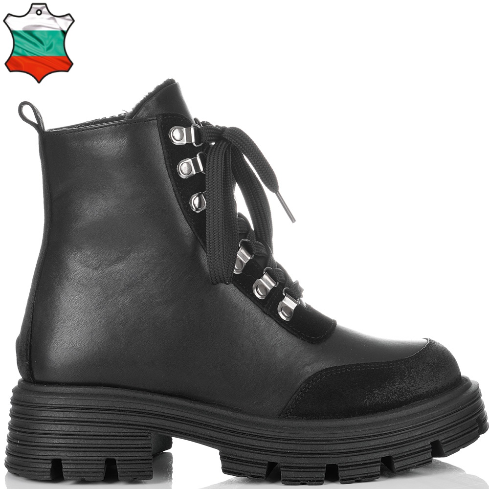 Невероятни боти от естествена кожа и елементи от естествен набук в черен цвят страхотно съчетани с модерно ходило. Кожата на този модел е много гладка и страхотно се оформя по крака, също така за по-голямо удобство моделът има връзки и цип за лесно пристягане и оформяне по крака, веднъж настроени връзките след това ботите се събуват и обуват само с ципа. Тези боти ще осигурят нужния Ви комфорт, топлина и удобство през целия ден, защото вътрешната част на модела е с тънък, мек и топъл хастар подходящ за зимата. В допълнение моделът е с олекотено термокаучуково ходило и дебел гарйфер, което е много стабилно и не се пързаля на заледени и заснежени участъци.