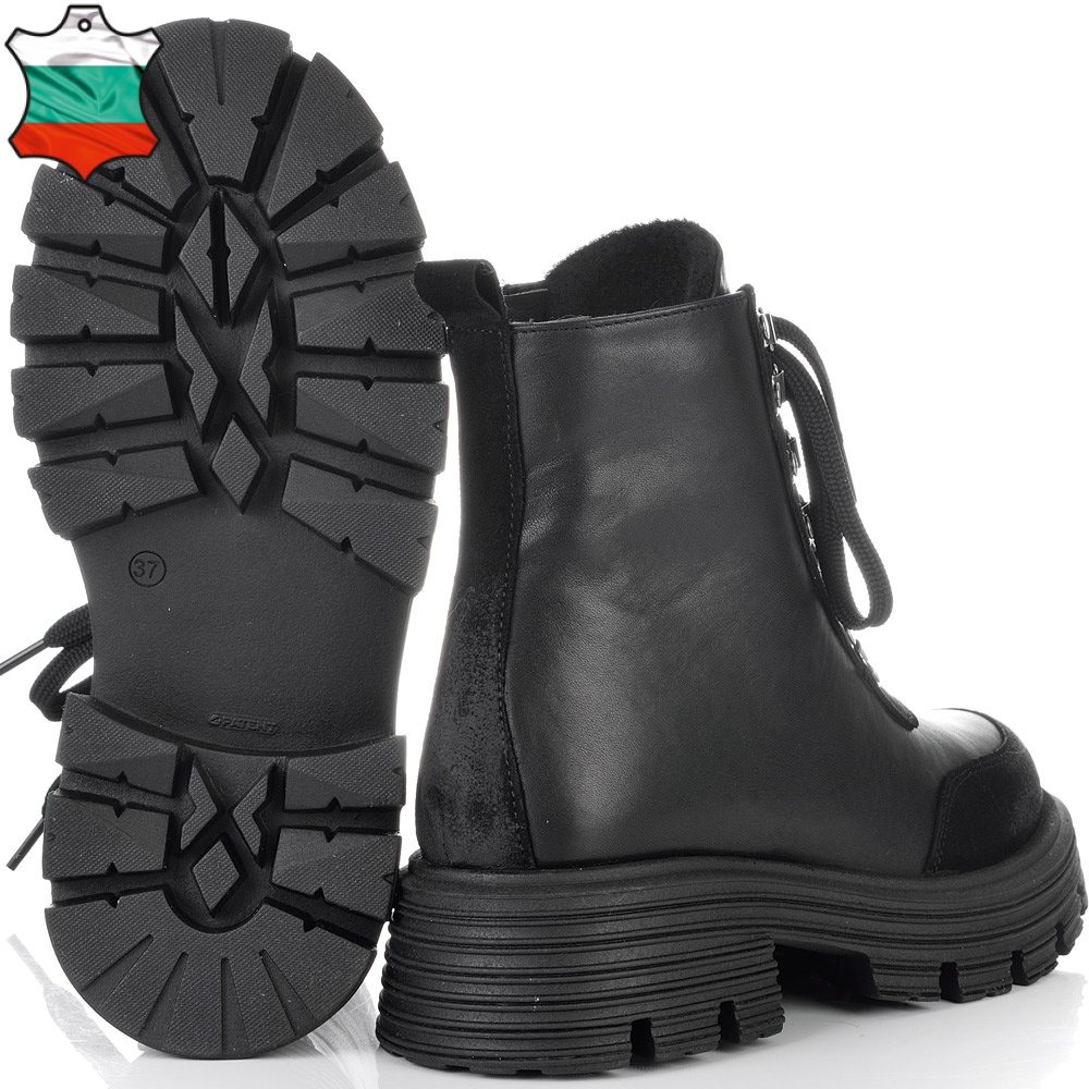 Невероятни боти от естествена кожа и елементи от естествен набук в черен цвят страхотно съчетани с модерно ходило. Кожата на този модел е много гладка и страхотно се оформя по крака, също така за по-голямо удобство моделът има връзки и цип за лесно пристягане и оформяне по крака, веднъж настроени връзките след това ботите се събуват и обуват само с ципа. Тези боти ще осигурят нужния Ви комфорт, топлина и удобство през целия ден, защото вътрешната част на модела е с тънък, мек и топъл хастар подходящ за зимата. В допълнение моделът е с олекотено термокаучуково ходило и дебел гарйфер, което е много стабилно и не се пързаля на заледени и заснежени участъци.