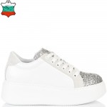 Уникални и неповторими кецове на високо повдигнато ходило с ефектен брокат в сребристо, в нежно съчетание на бяла естествена кожа и сив естествен велур. Блясъкът винаги е на мода, а с тези кецове просто ще заблестите. Вътрешната част на модела също е изцяло от естествена кожа, а стелката е Footbed, която е изключително мека и се оформя по стъпалото на принципа на мемори пяна. В допълнение моделът е с олекотено полиуретаново ходило, шито и лепено, което перфектно допълва комфорта на модела и следва естествената линия на движение на краката. С тях ще бъдете просто неотразима.