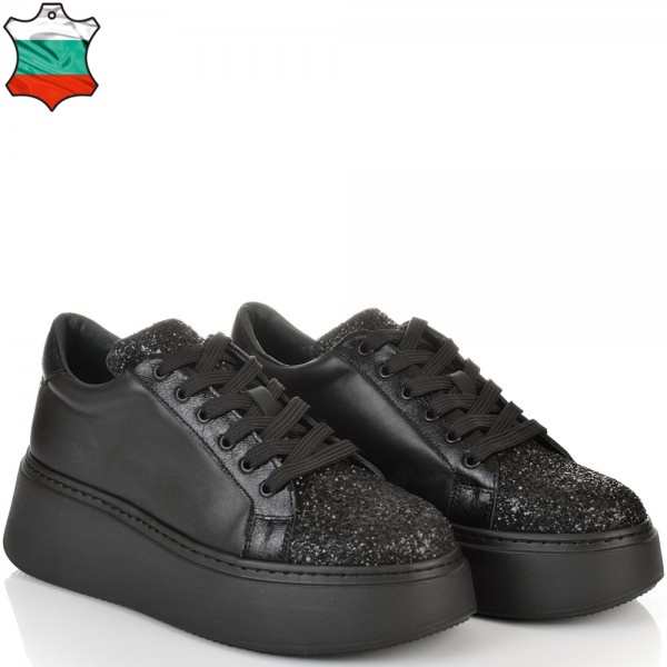 Уникални и неповторими кецове на високо повдигнато ходило с ефектен черен брокат, в нежно съчетание на черна естествена кожа и черен естествен лак. Блясъкът винаги е на мода, а с тези кецове просто ще заблестите. Вътрешната част на модела също е изцяло от естествена кожа, а стелката е Footbed, която е изключително мека и се оформя по стъпалото на принципа на мемори пяна. В допълнение моделът е с олекотено полиуретаново ходило, шито и лепено, което перфектно допълва комфорта на модела и следва естествената линия на движение на краката. С тях ще бъдете просто неотразима.