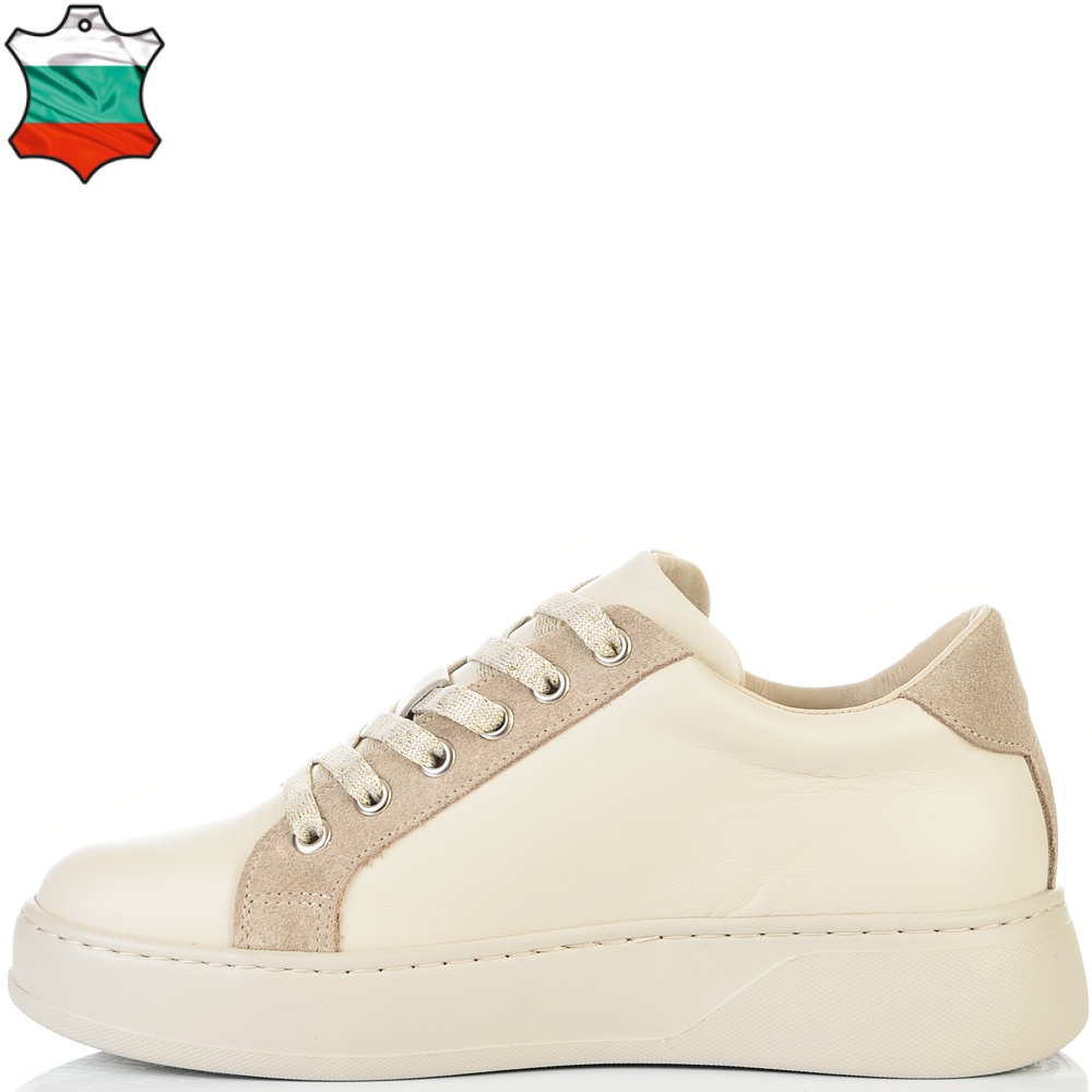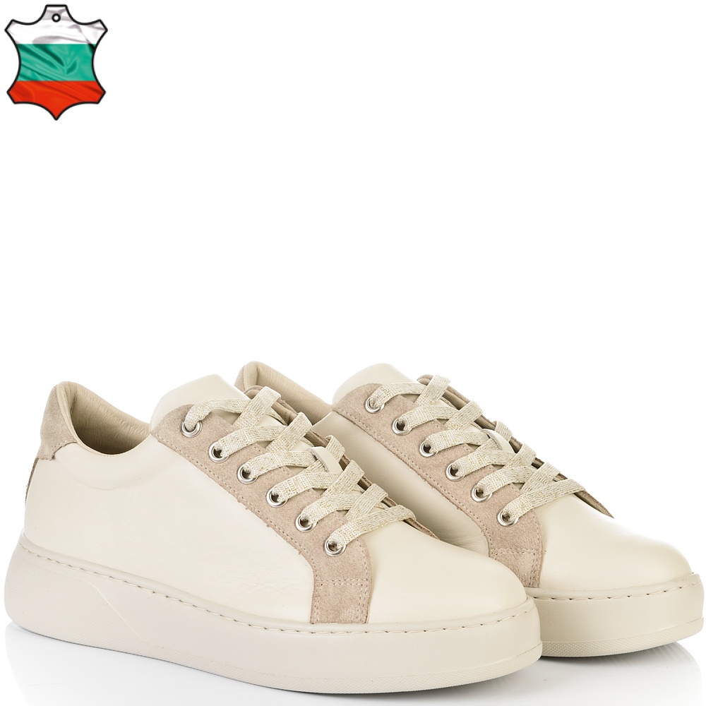Класически модел дамски кецове в нежно съчетание на бежова естествена кожа и бежов естествен велур. С избора на този модел няма как да се сгреши, винаги модерни, лесно се съчетават с всякакъв тип облекло и изключително леки и удобни. Вътрешната част на модела също е изцяло от естествена кожа, а стелката е Footbed, която е изключително мека и се оформя по стъпалото на принципа на мемори пяна. В допълнение моделът е с олекотено полиуретаново ходило, шито и лепено, което перфектно допълва комфорта на модела и следва естествената линия на движение на краката. С тях ще бъдете просто неотразима.