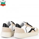 Стлен и страхотен нов модел. Кецовете са в нежно съчетание на бяла и черна кожа с бежов велур. Вътрешната част на модела също е изцяло от естествена кожа, а стелката е Footbed, която е изключително мека и се оформя по стъпалото на принципа на мемори пяна. В допълнение моделът е с олекотено полиуретаново ходило, шито и лепено, което перфектно допълва комфорта на модела и следва естествената линия на движение на краката.