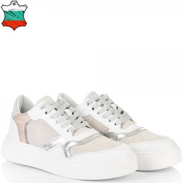 Стлни и нежни кецове в съчетание на бяла естествена кожа, бял велур и ефектни свежи цветове на хамелеонова пудра и сребристо. Моделът ще допринесе много свежест и стил във вашата визия. Вътрешната част на модела също е изцяло от естествена кожа, а стелката е Footbed, която е изключително мека и се оформя по стъпалото на принципа на мемори пяна. В допълнение моделът е с олекотено полиуретаново ходило, шито и лепено, което перфектно допълва комфорта на модела и следва естествената линия на движение на краката.