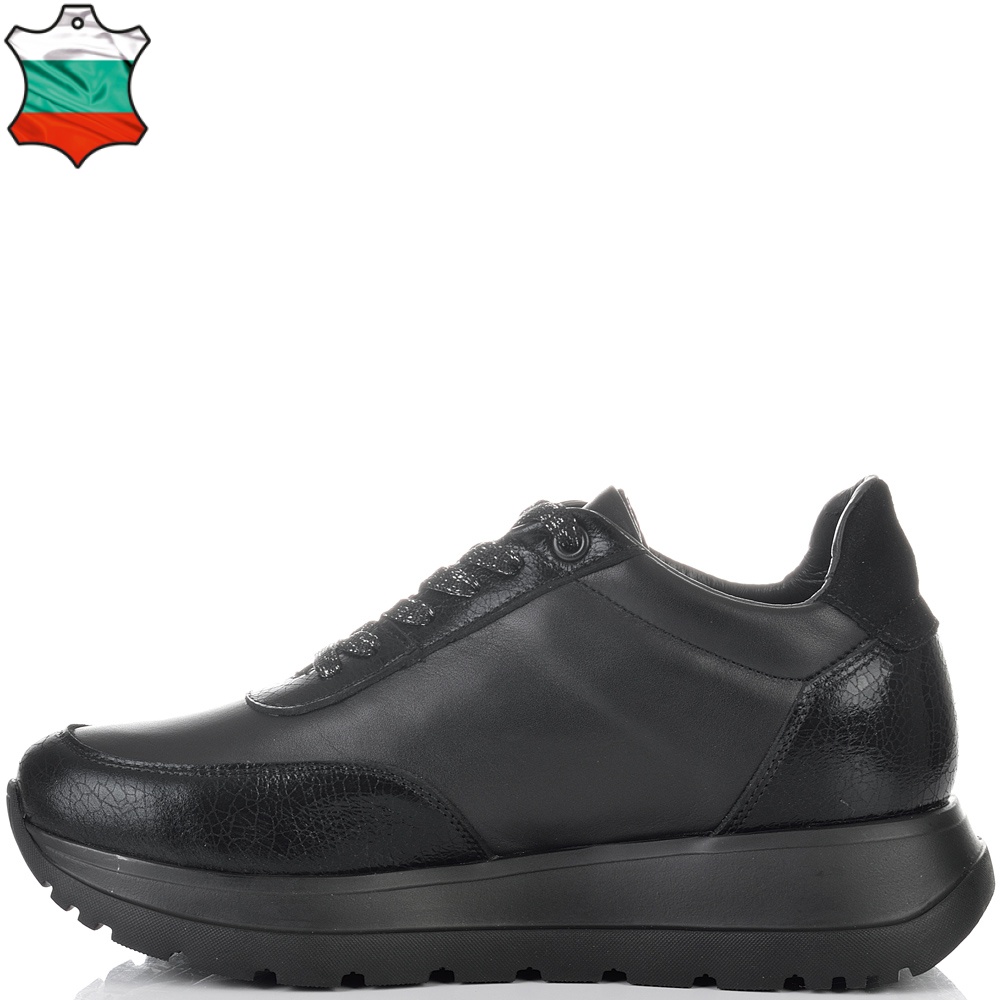 Класически модел дамски сникърси от естествена кожа в черен цвят съчетан с ефектна черна кожа. Вътрешната част на модела също е изцяло от естествена кожа, а стелката е Footbed, която е изключително мека и се оформя по стъпалото на принципа на мемори пяна. В допълнение моделът е с олекотено полиуретаново ходило, което перфектно допълва комфорта на модела и следва естествената линия на движение на краката.