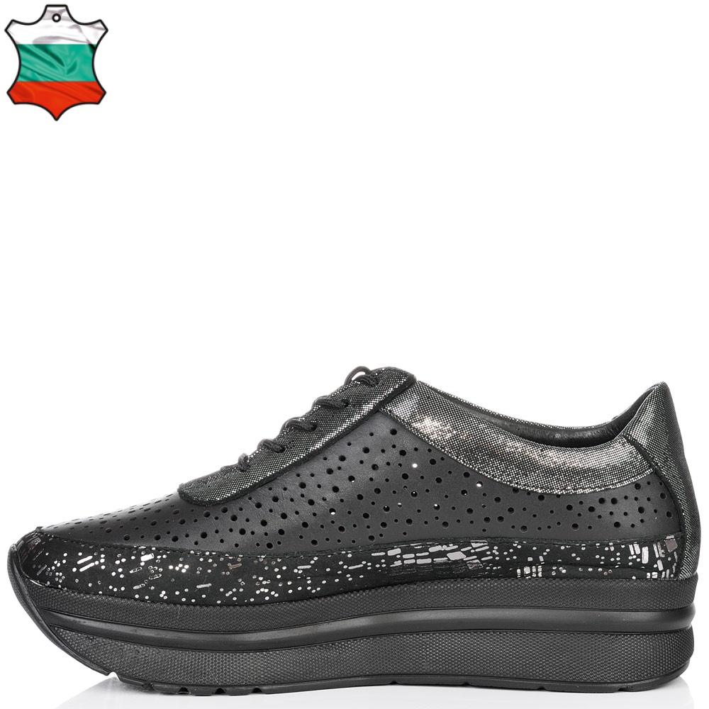 Дамски обувки на цялостна платформа с лазерна перфорация в нежно съчетание на черно и ефектни бронзови кожи. Перфектен избор, защото са подходящи както за пролетта така и за лятото, заради самата перфорацията, а и лесно се съчетават с всякакви тоалети от дънки и панталони, до поли и рокли. Стелката на модела е мека, а ходилото е олекотено полиуретаново, което е много стабилно и перфектно допринася за цялостния комфорт на модела.