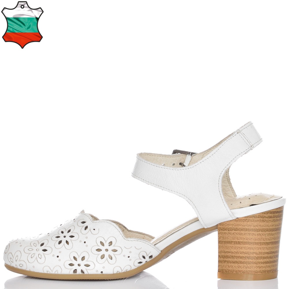 Дамски пролетно-летни бели обувки на стабилен анатомичен ток с височина 6 см. Произведени изцяло от естествена кожа в България.