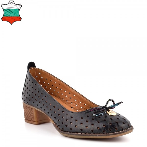 Български дамски черни обувки на нисък, стабилен и удобен ток. Обувите са изработени изцяло от естествена кожа с финна лазеран перурация.