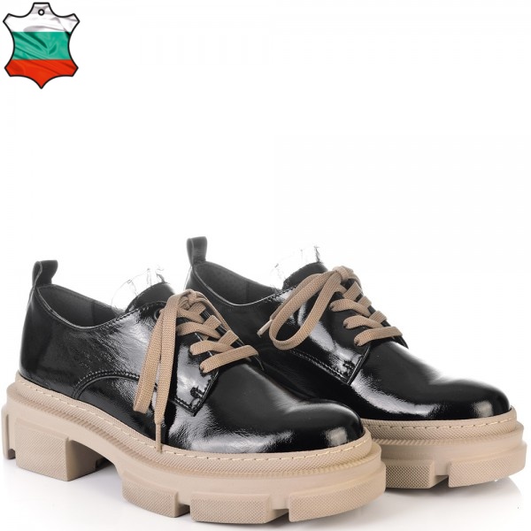 Изключително удобни на спортно-елегантно бежово ходило в черен естествен лак, нашите нови обувки ще Ви накарат да се чувствате прекрасно. Обувките имат нежна черна дантела на езика, а връзките са в бежов цвят, който се съчетава перфектно с цвета на ходилото.Тези обувки са изключително удобни, защото са изработени от полиуретаново ходило, което следва естествената линия на движение на походката. Лесно се съчетават с всякакви тоалети във Вашето ежедневие, от рокли и поли, до панталони и дънки с тях ще сте неотразима, защото комфорта Ви отива.