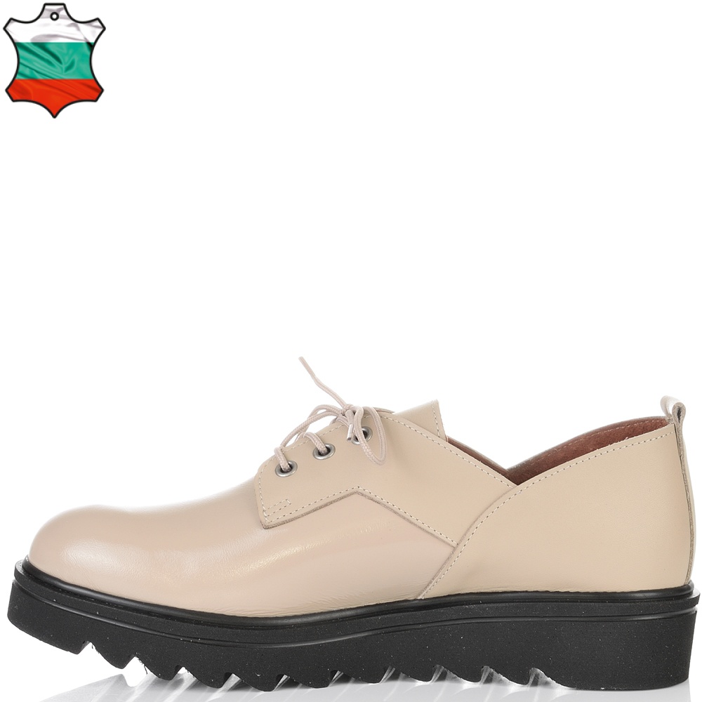 Дамски ежедневни обувки с връзки в съчетание на бежов лак с бежова кожа. Моделът изключително стилен и удобен и лесно се съчетава с всякакъв тип тоалети. Стелката е мека и се оформя по стъпалото на принципа на мемори пяна. Моделът е много лек, защото е изработен от олекотено полиуретаново ходило, което следва естествената линия на движение на походката.